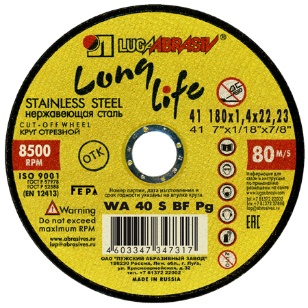 Круг отрезной 41 180*1,4*22,2 long life нерж